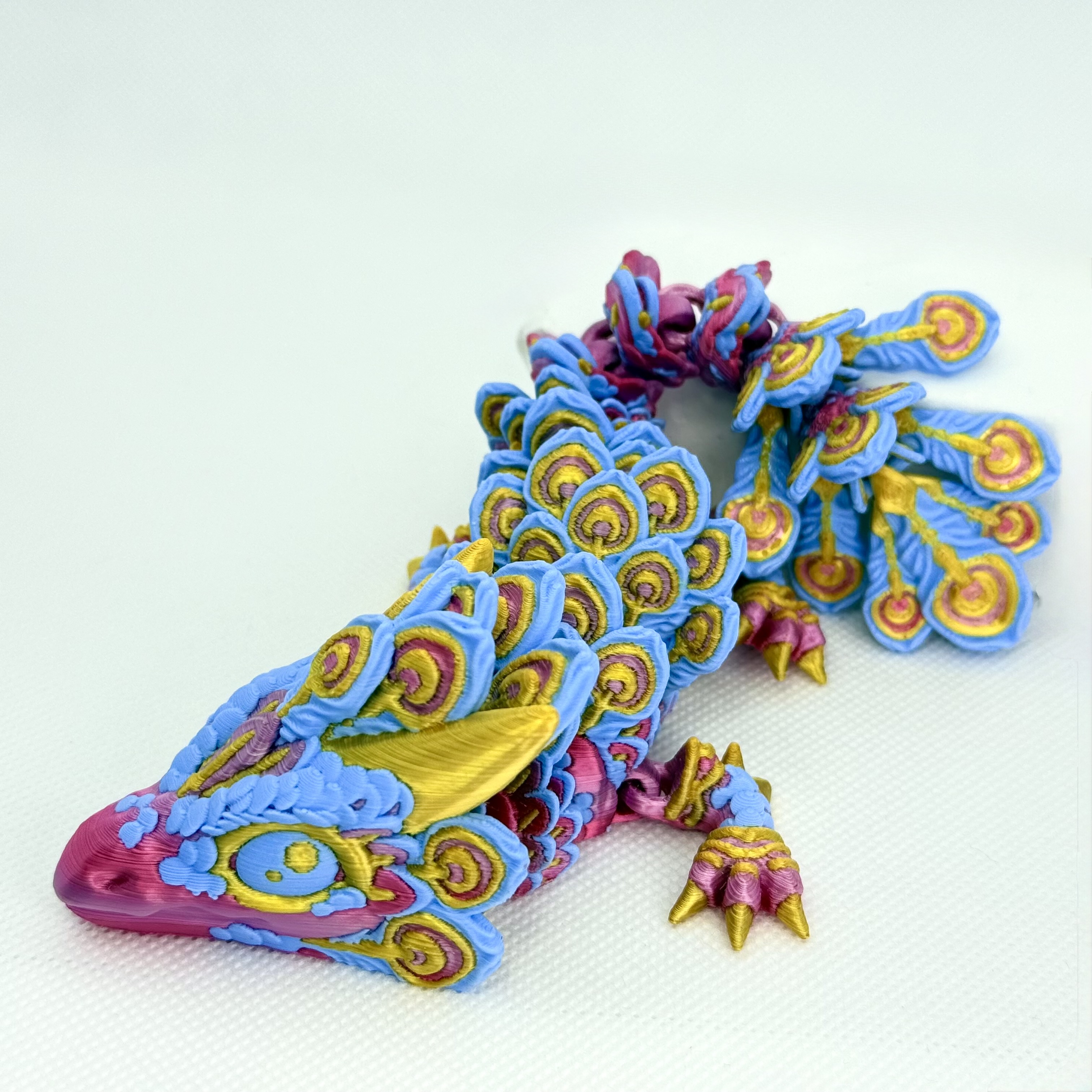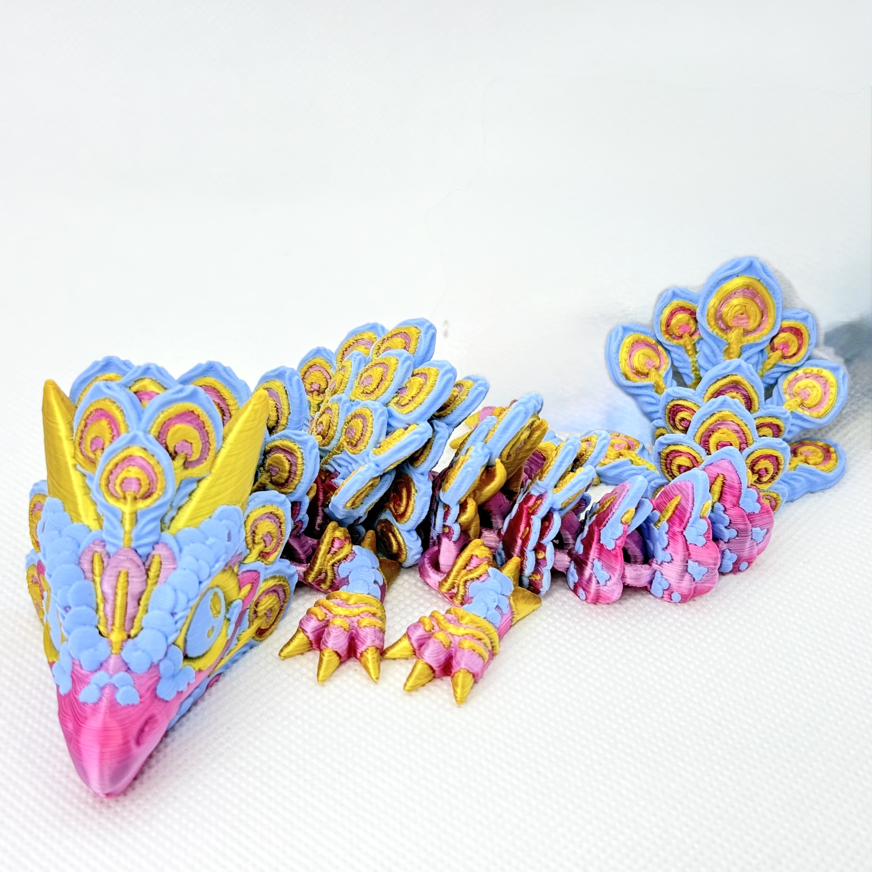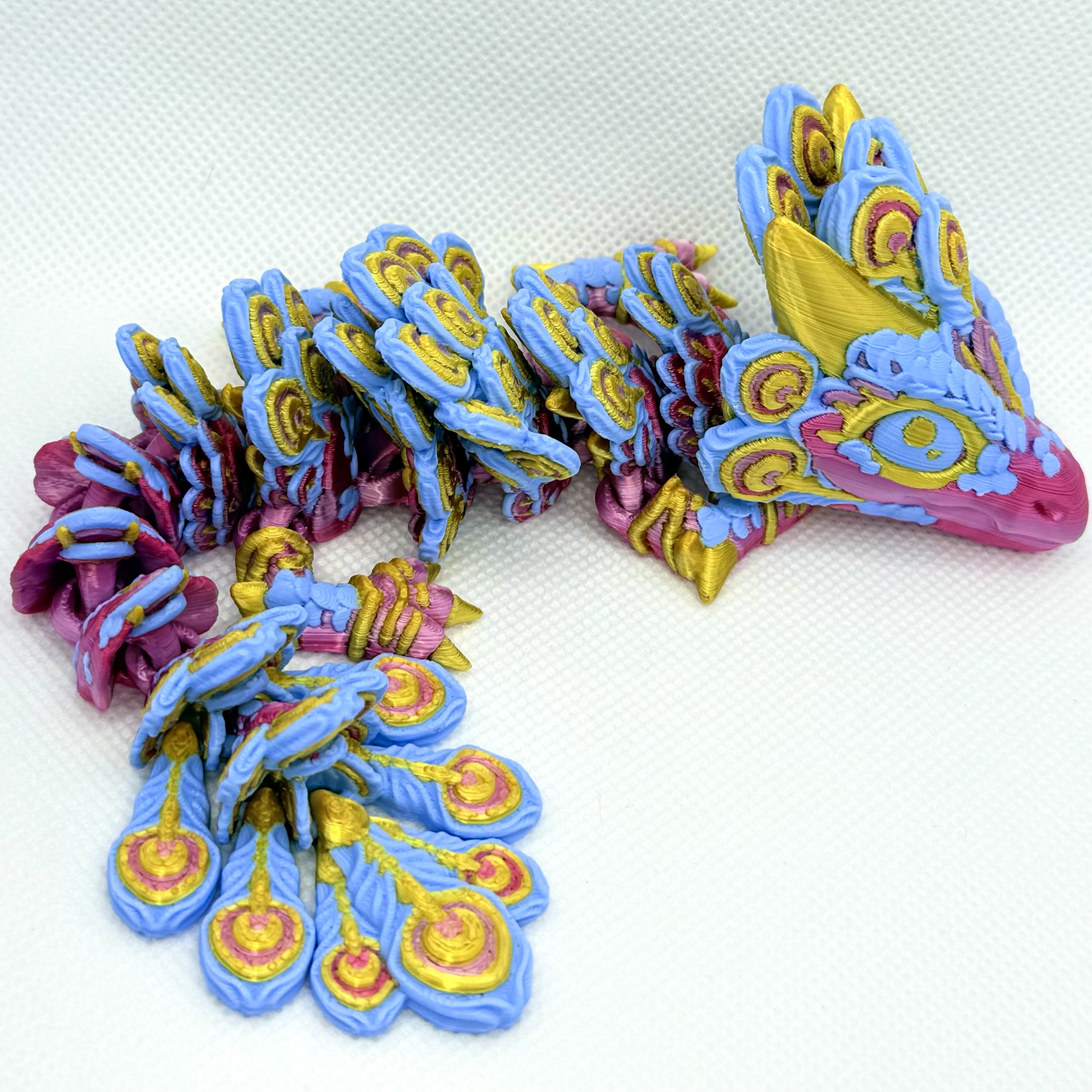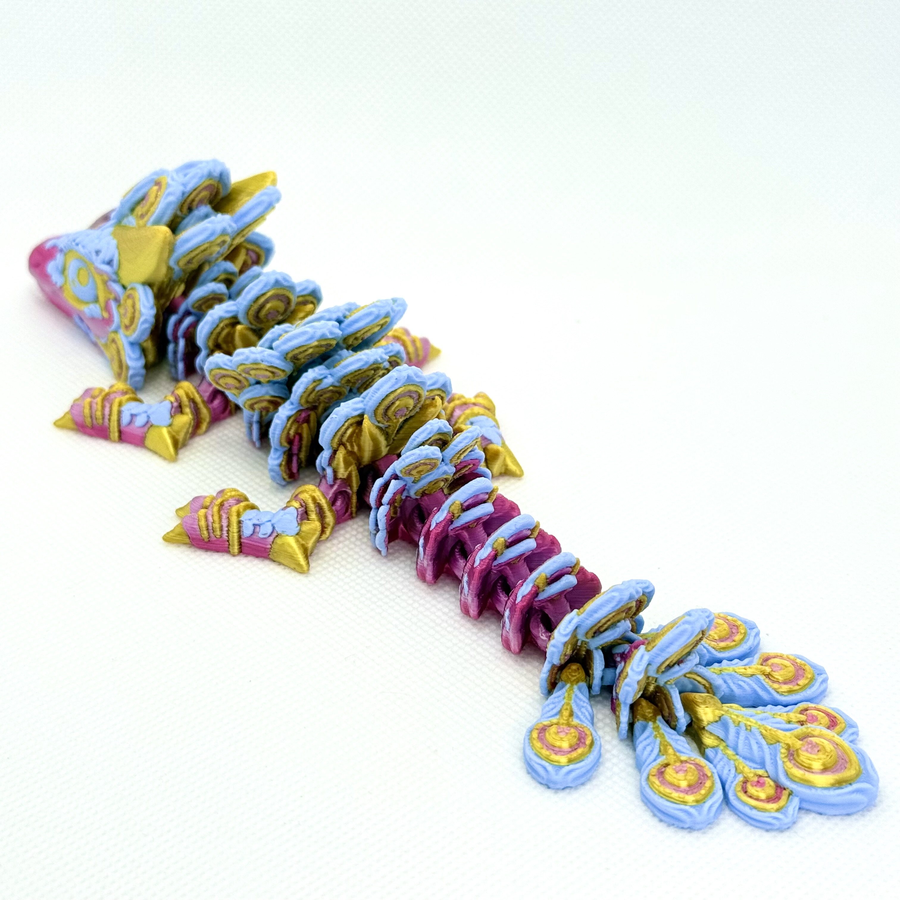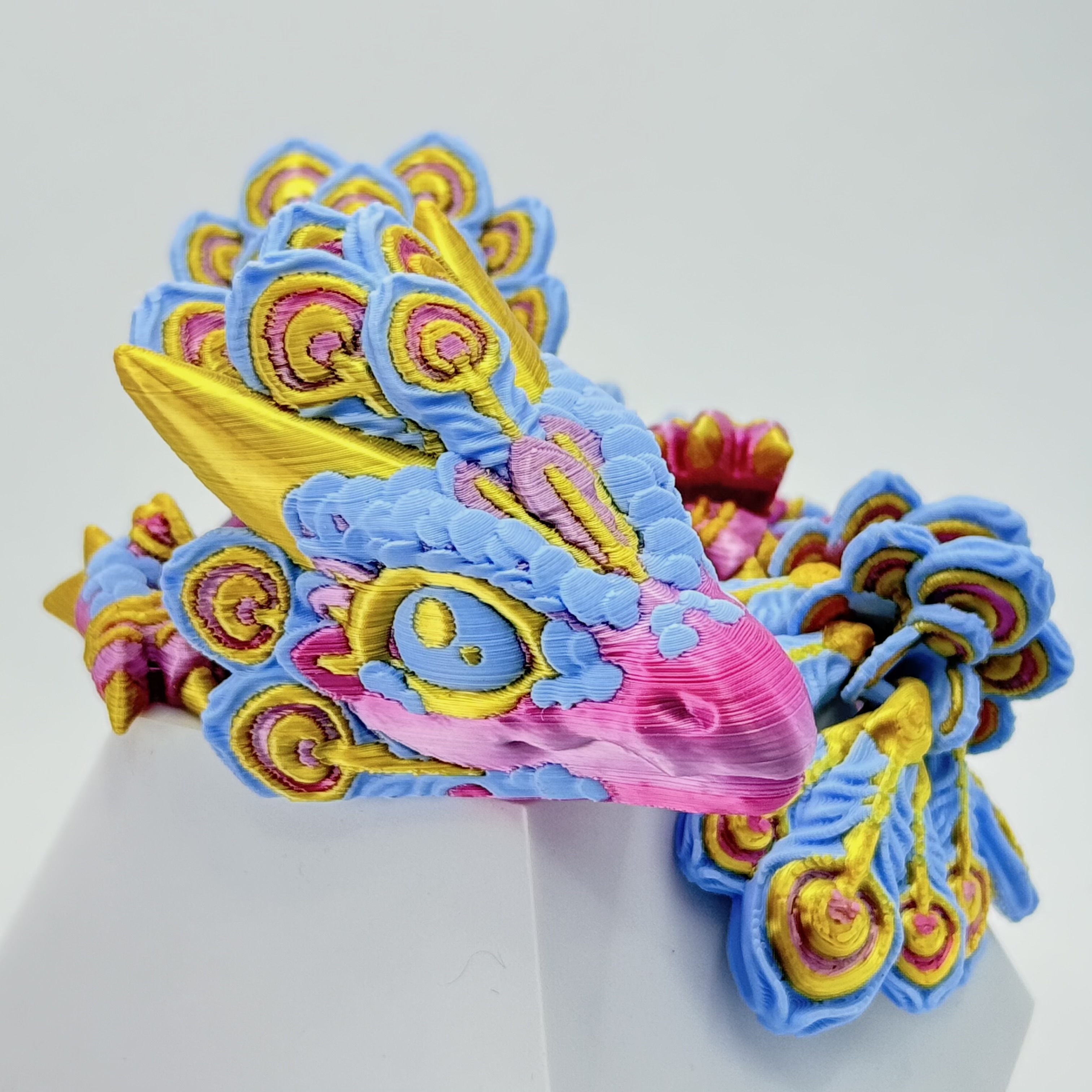 Wydrukowany z wielokolorowego filamentu, zachwyca gradientem różu z delikatnymi złotymi akcentami i błękitnymi detalami. Dzięki specjalnej technologii „flexi” smok jest elastyczny, można poruszać jego ciałem i układać go w różnych pozach.