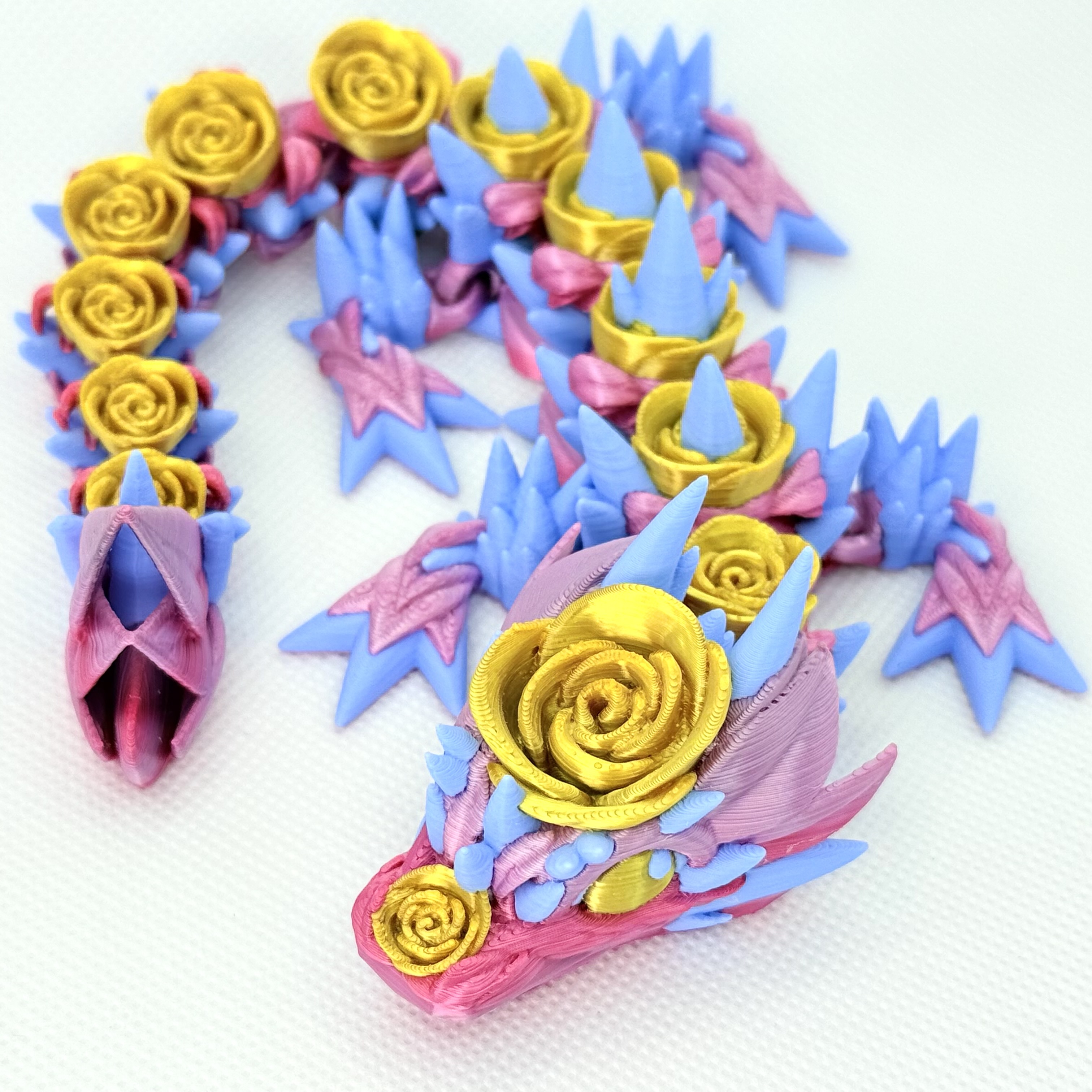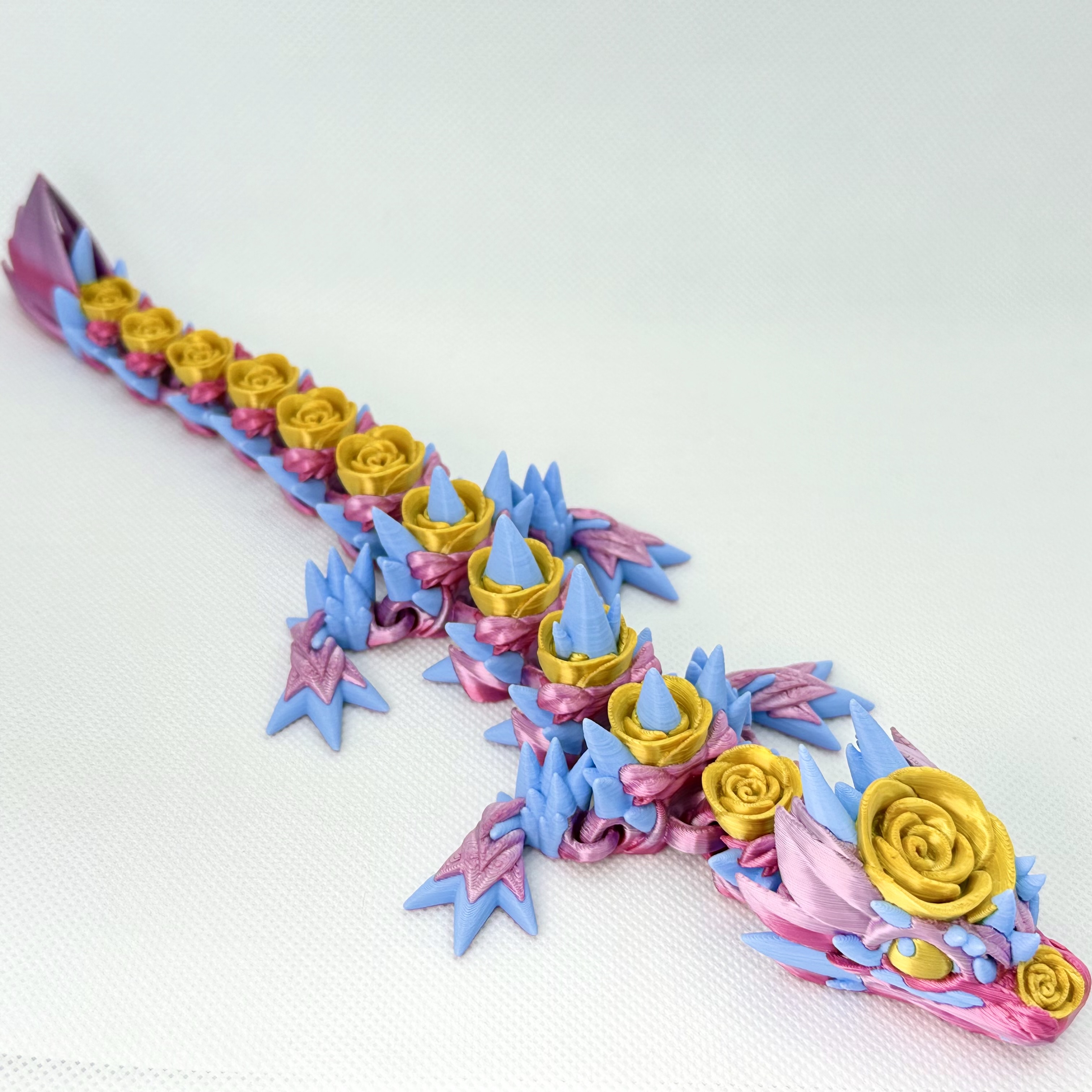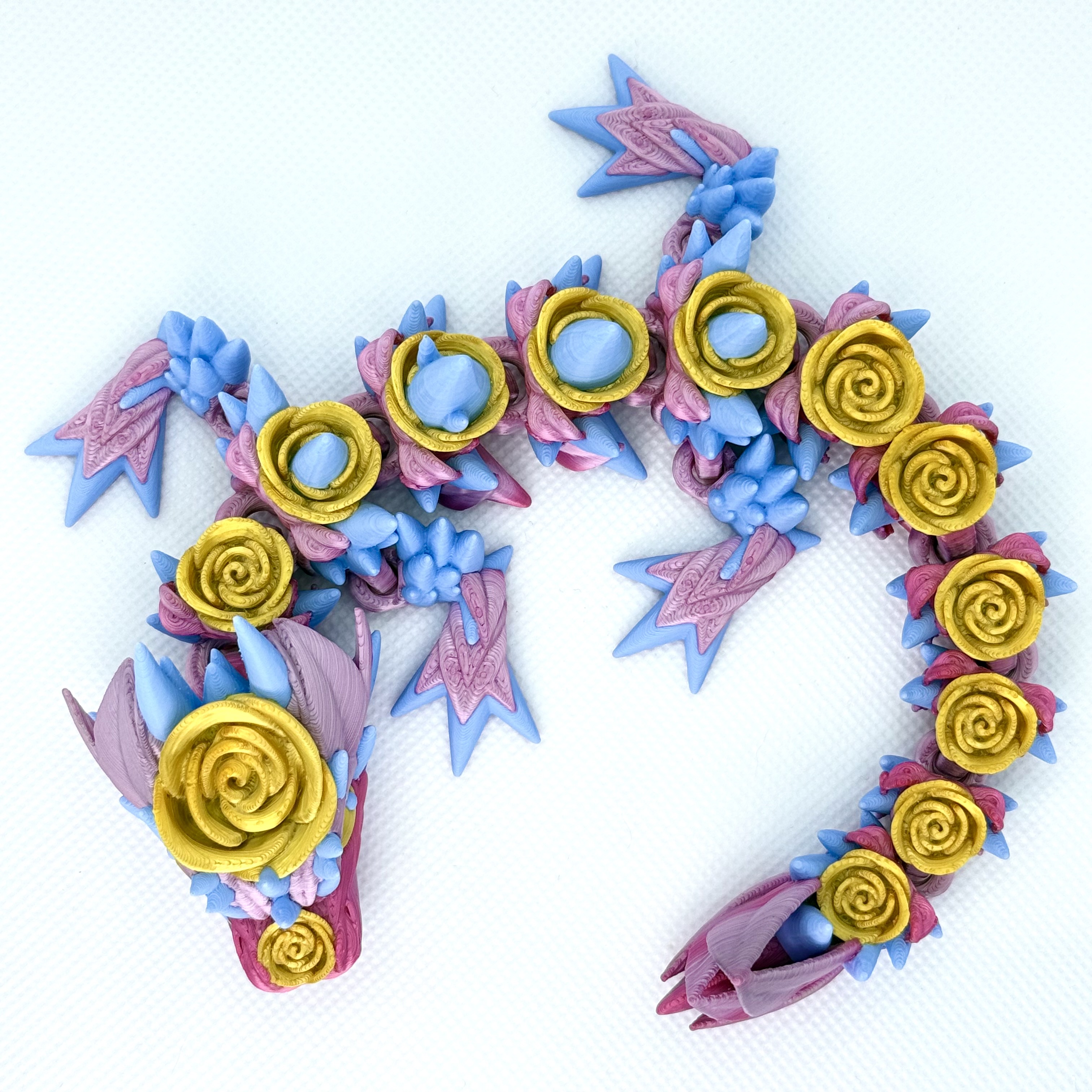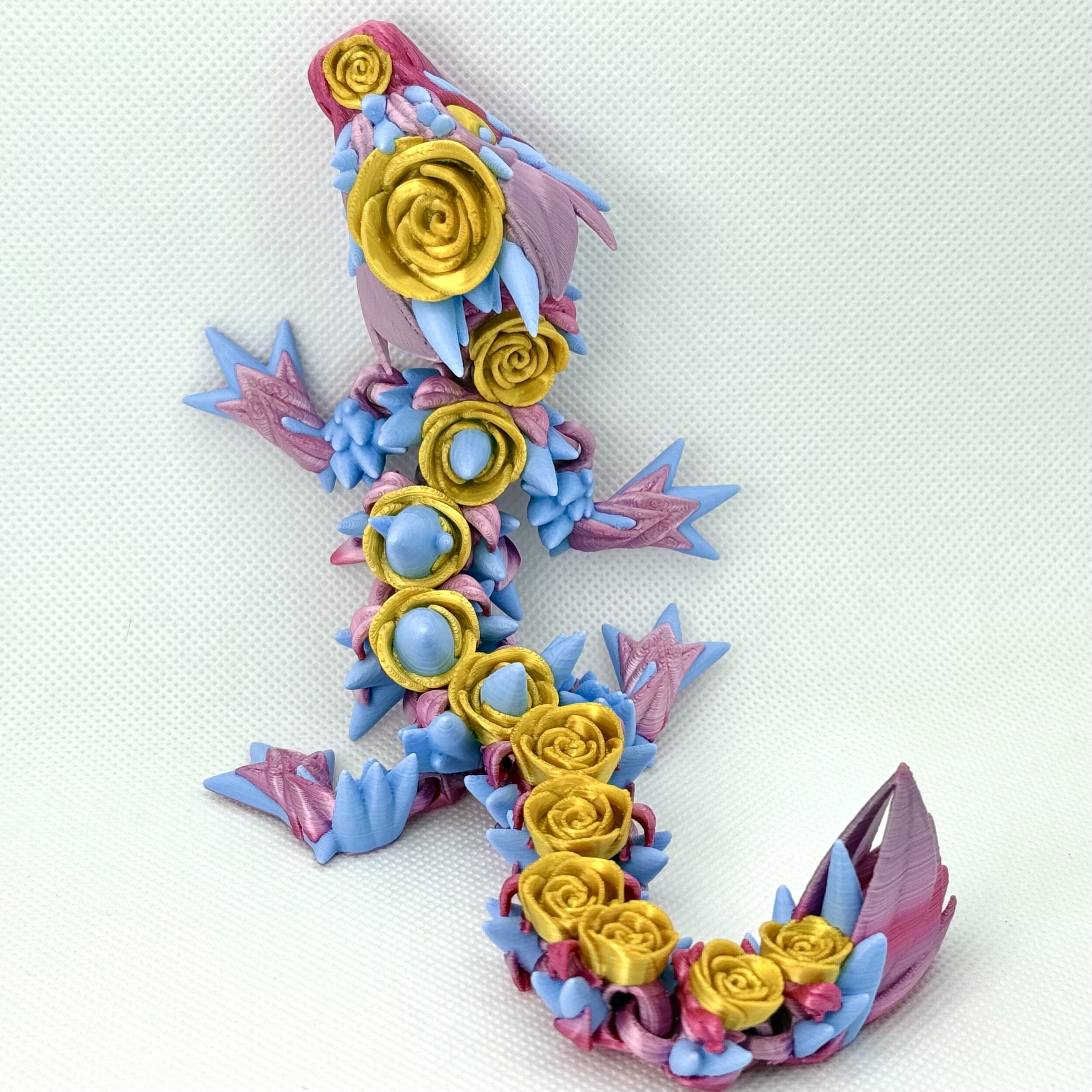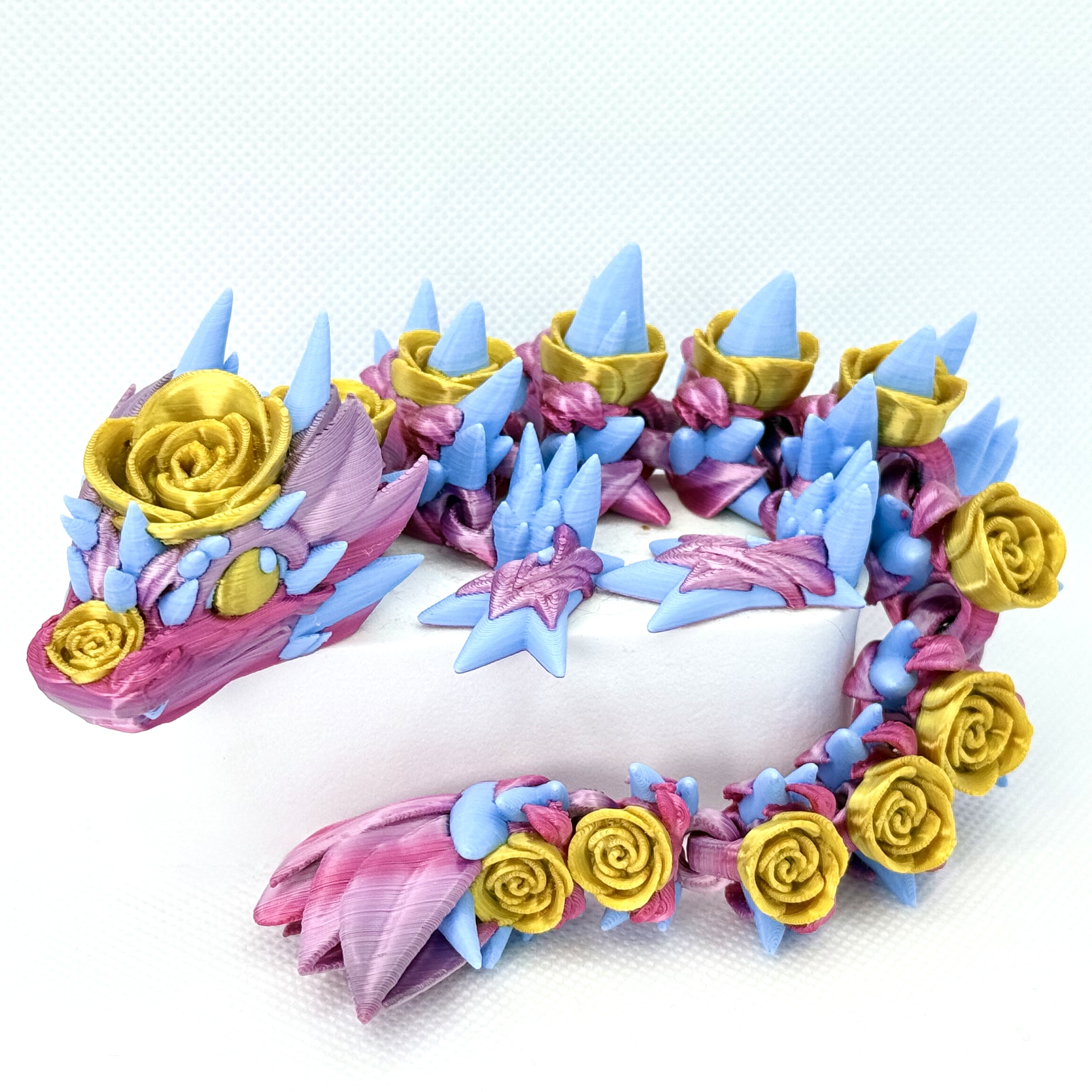 Wydrukowany z wielokolorowego filamentu, zachwyca gradientem różu z delikatnymi złotymi akcentami i błękitnymi detalami. Dzięki specjalnej technologii „flexi” smok jest elastyczny, można poruszać jego ciałem i układać go w różnych pozach.