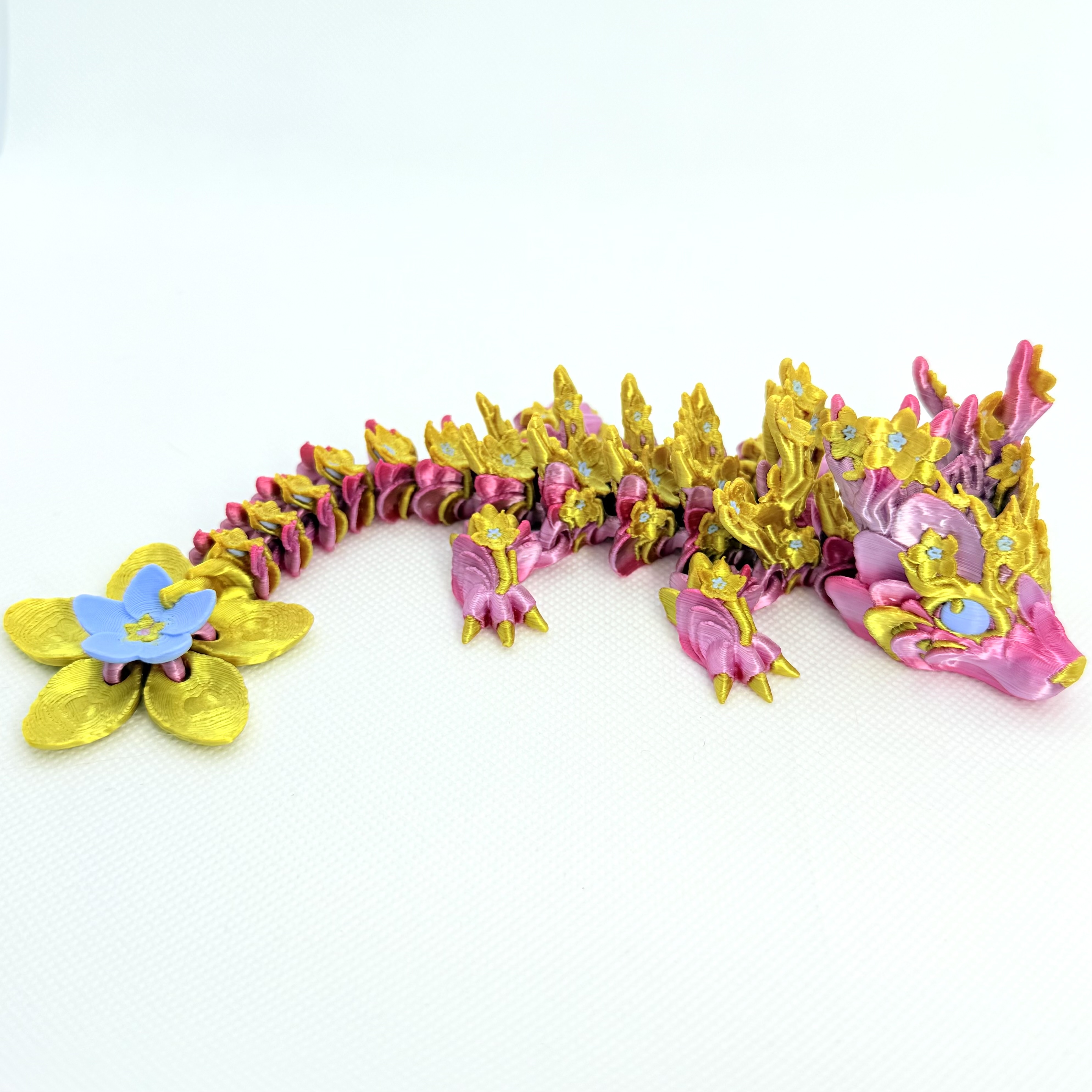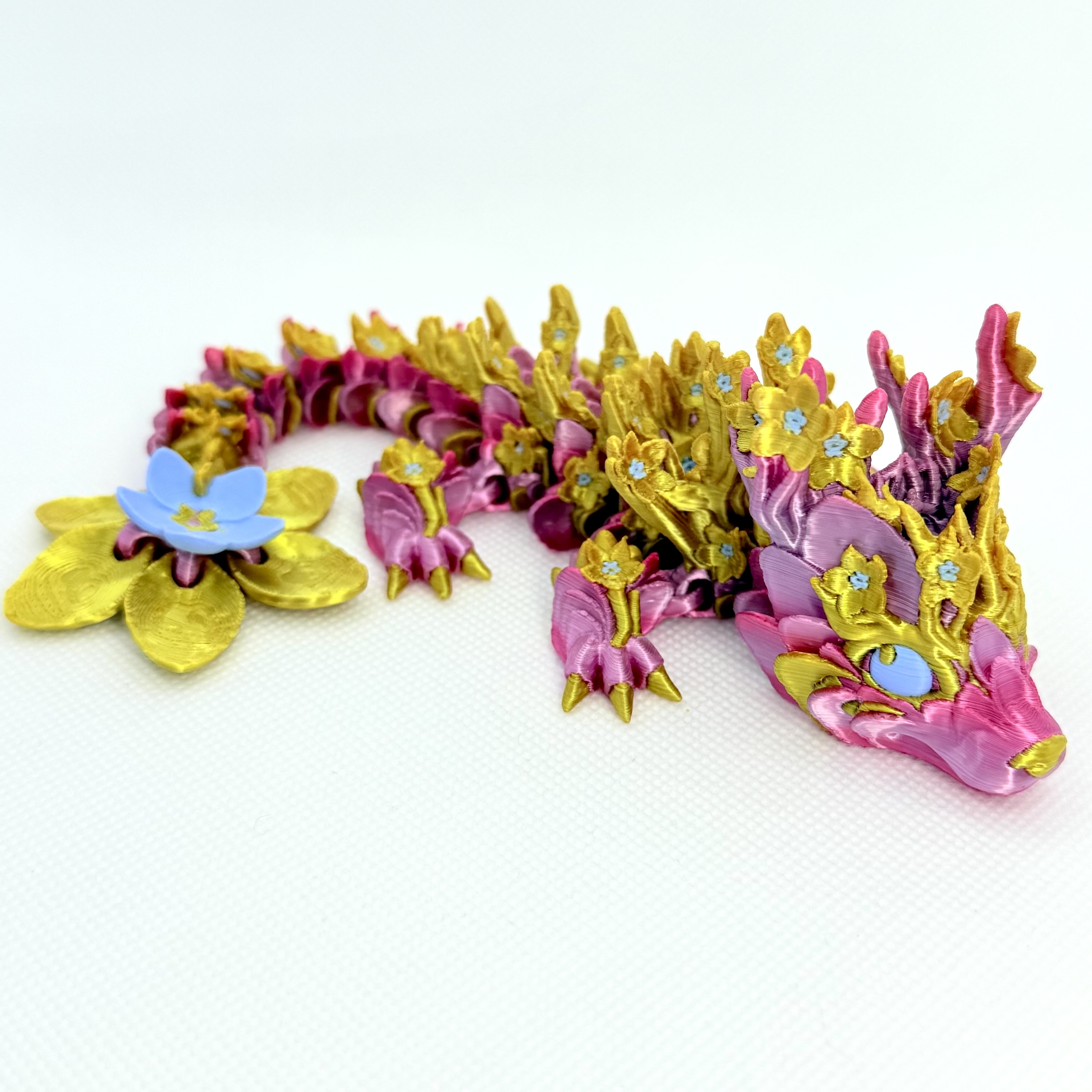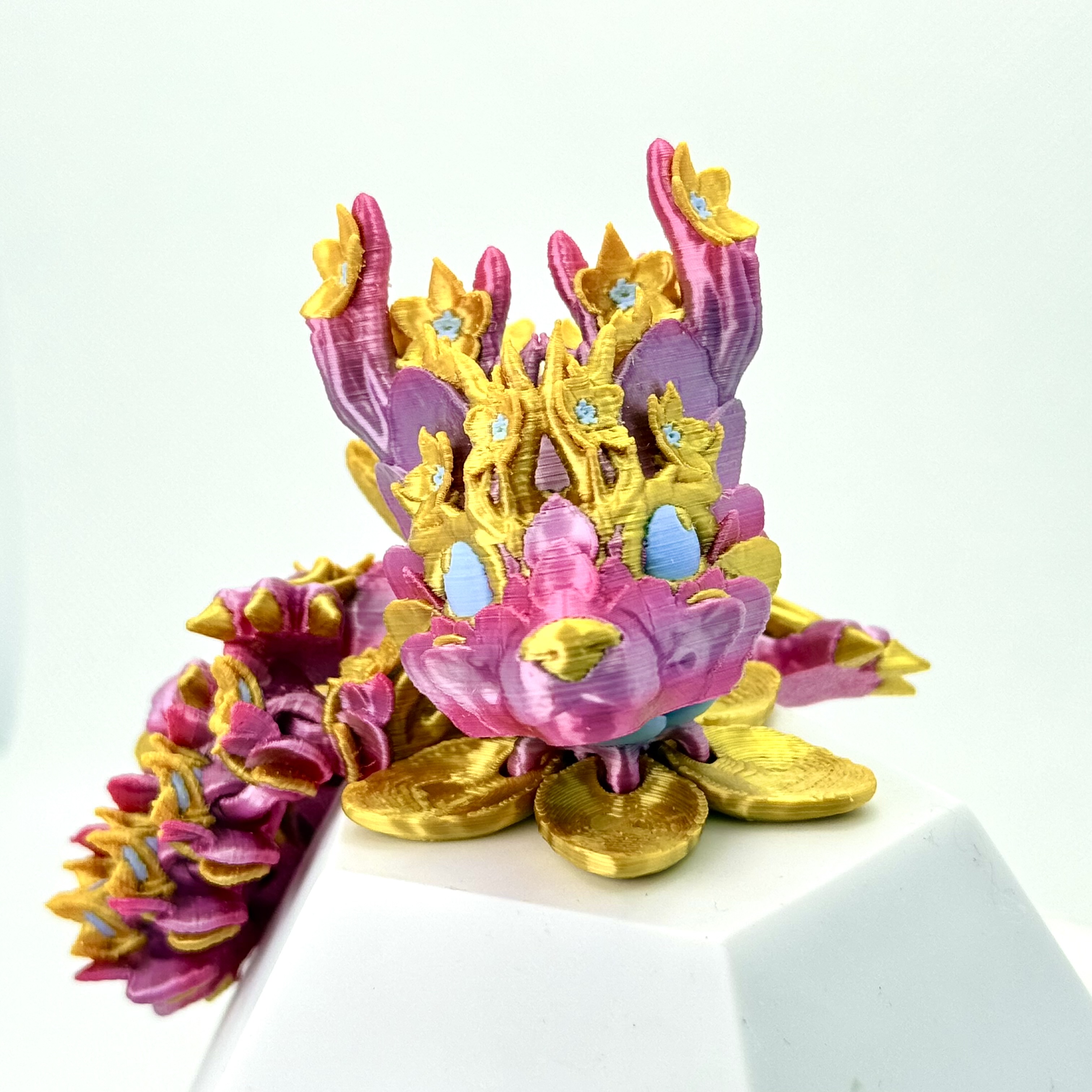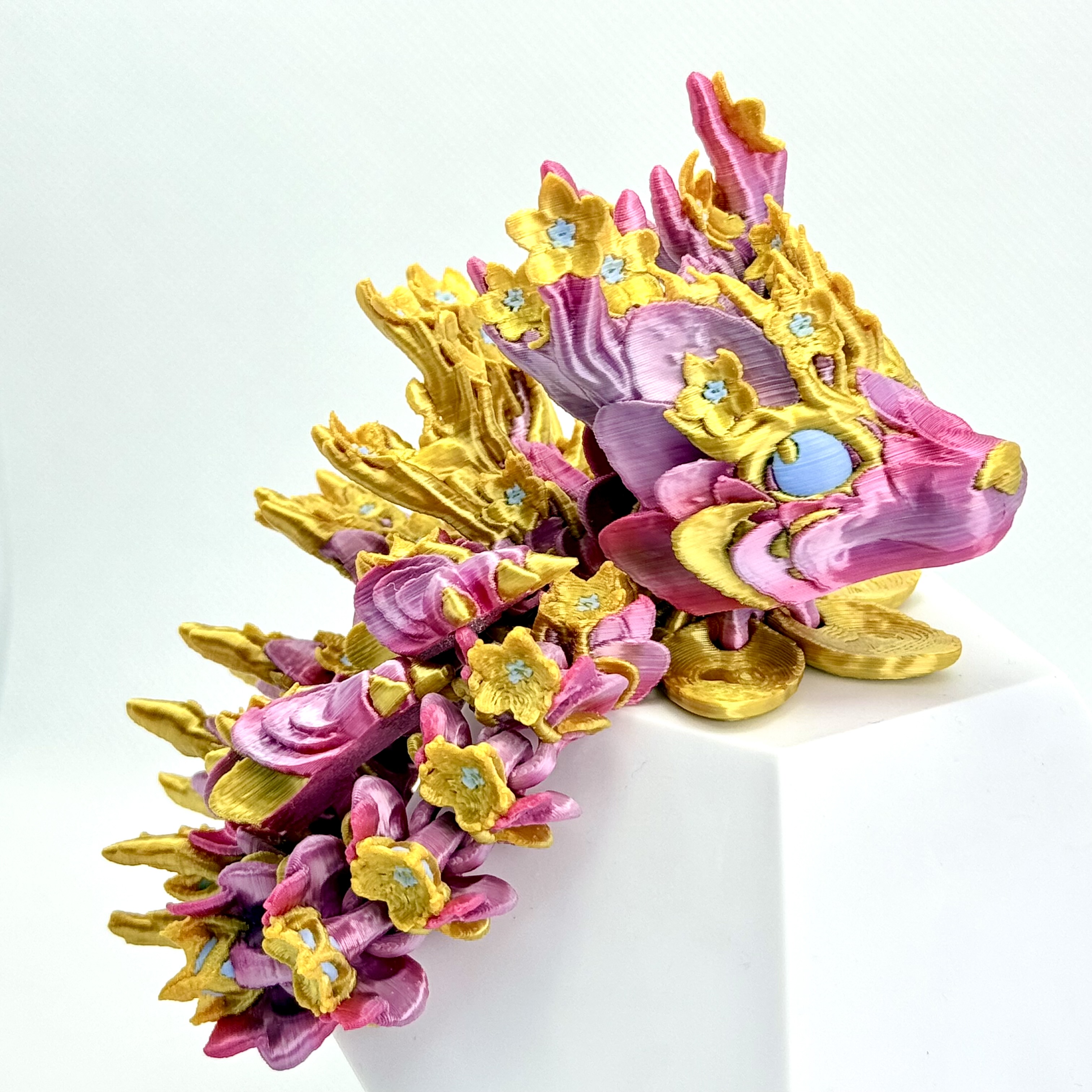Wydrukowany z wielokolorowego filamentu, zachwyca gradientem różu z delikatnymi złotymi akcentami i błękitnymi detalami. Dzięki specjalnej technologii „flexi” smok jest elastyczny, można poruszać jego ciałem i układać go w różnych pozach.