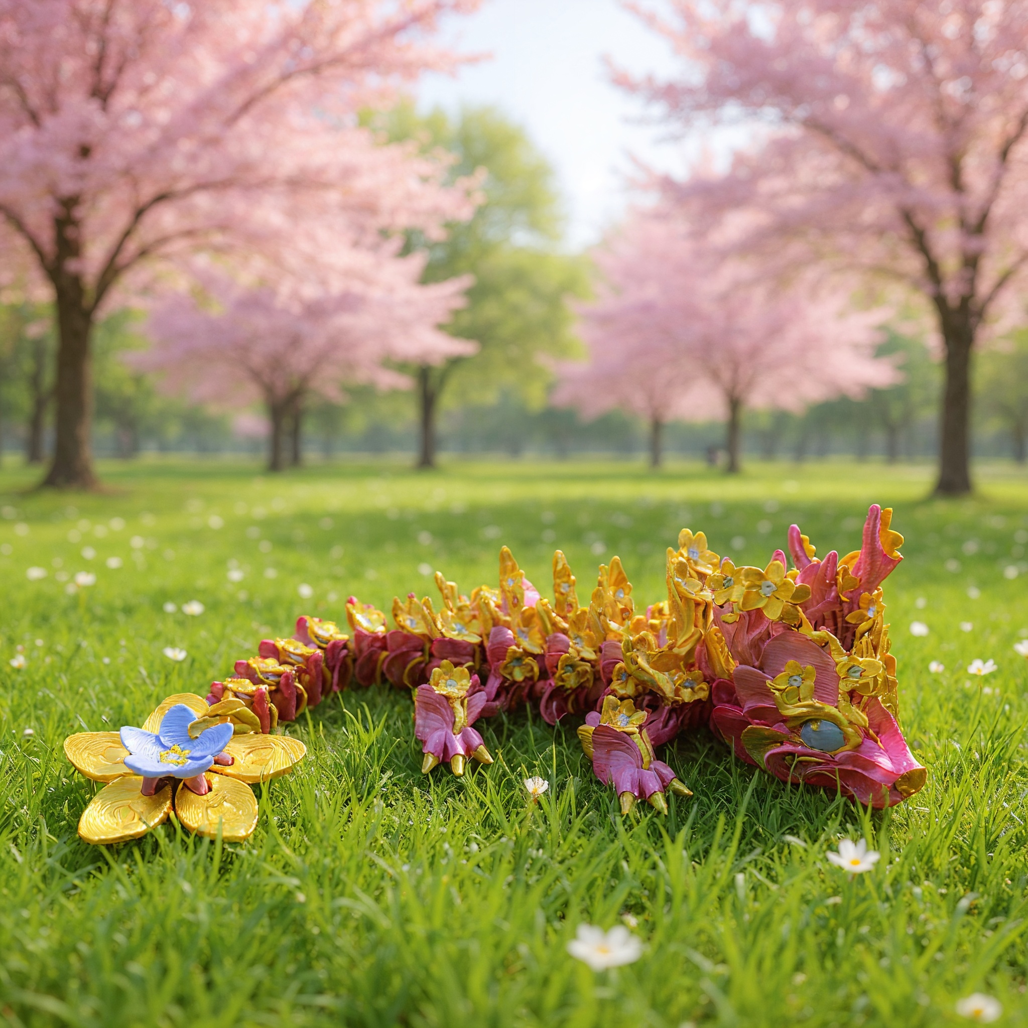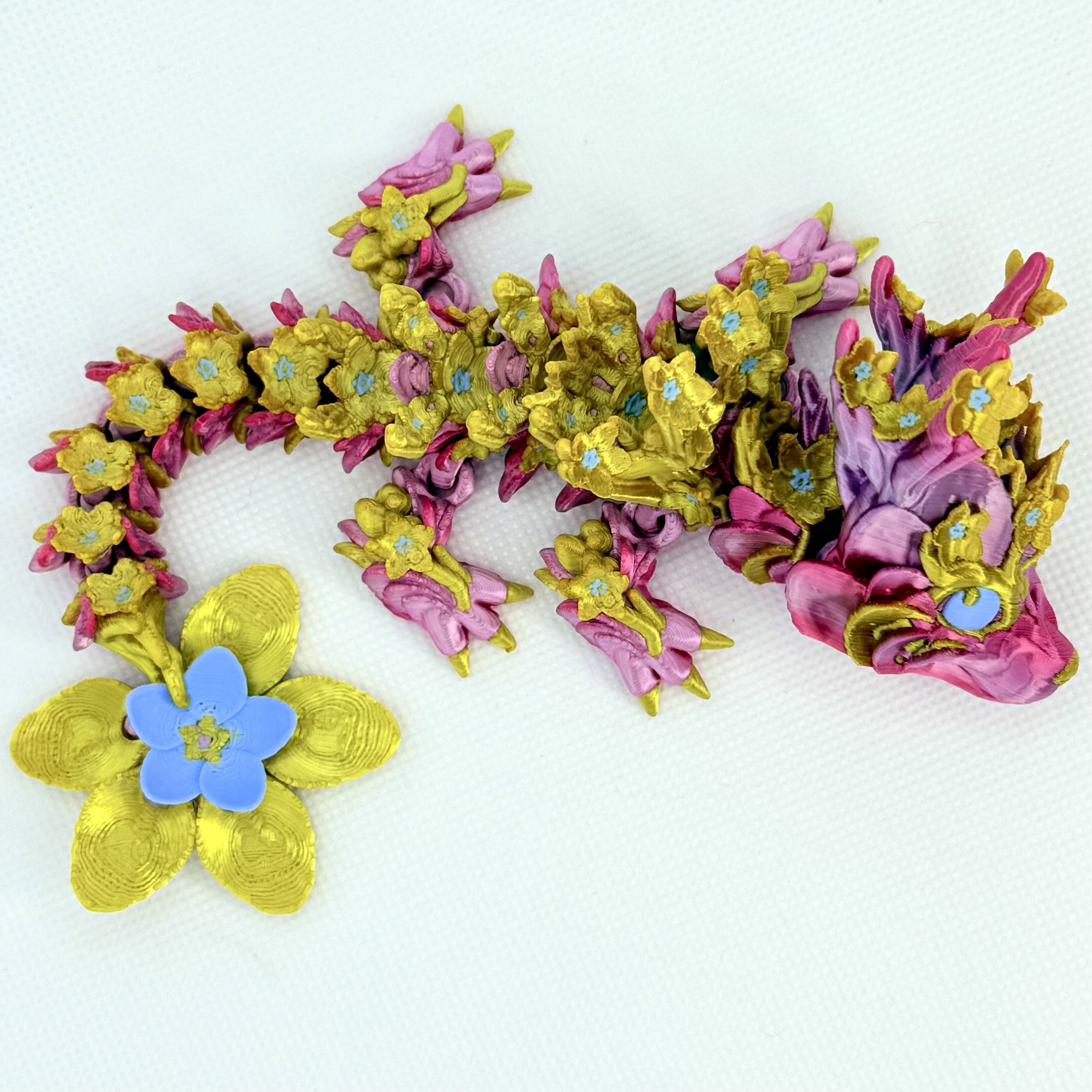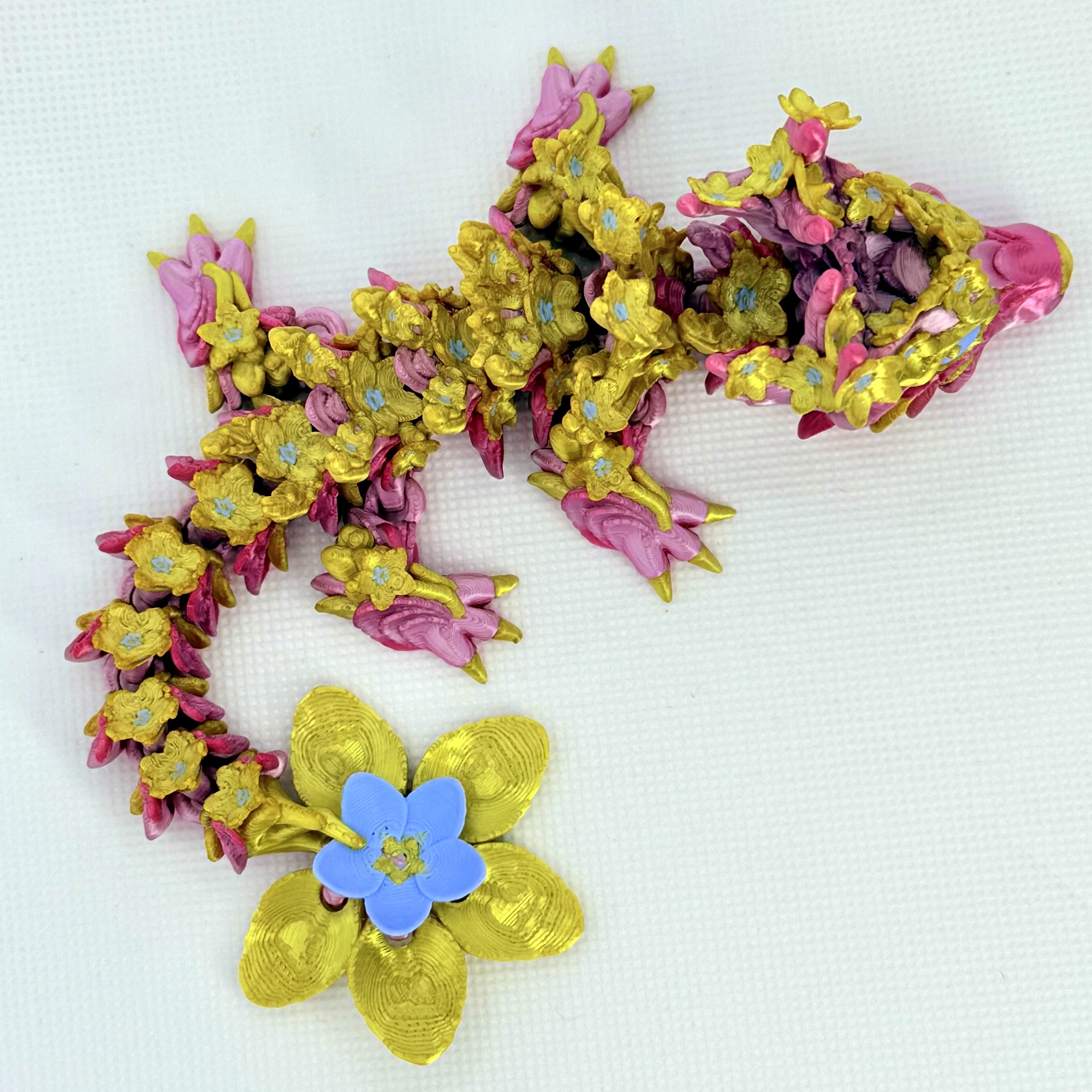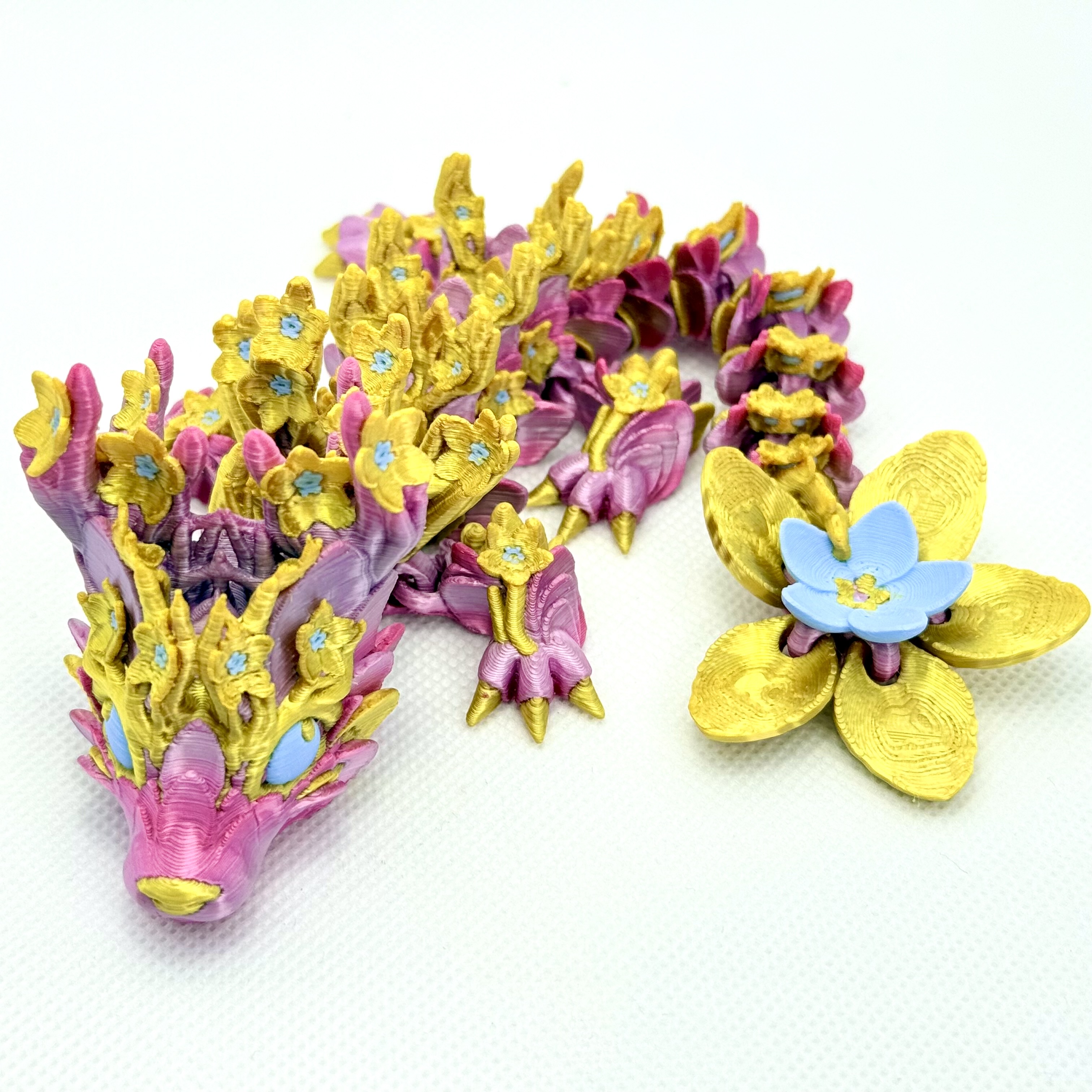 Wydrukowany z wielokolorowego filamentu, zachwyca gradientem różu z delikatnymi złotymi akcentami i błękitnymi detalami. Dzięki specjalnej technologii „flexi” smok jest elastyczny, można poruszać jego ciałem i układać go w różnych pozach.
