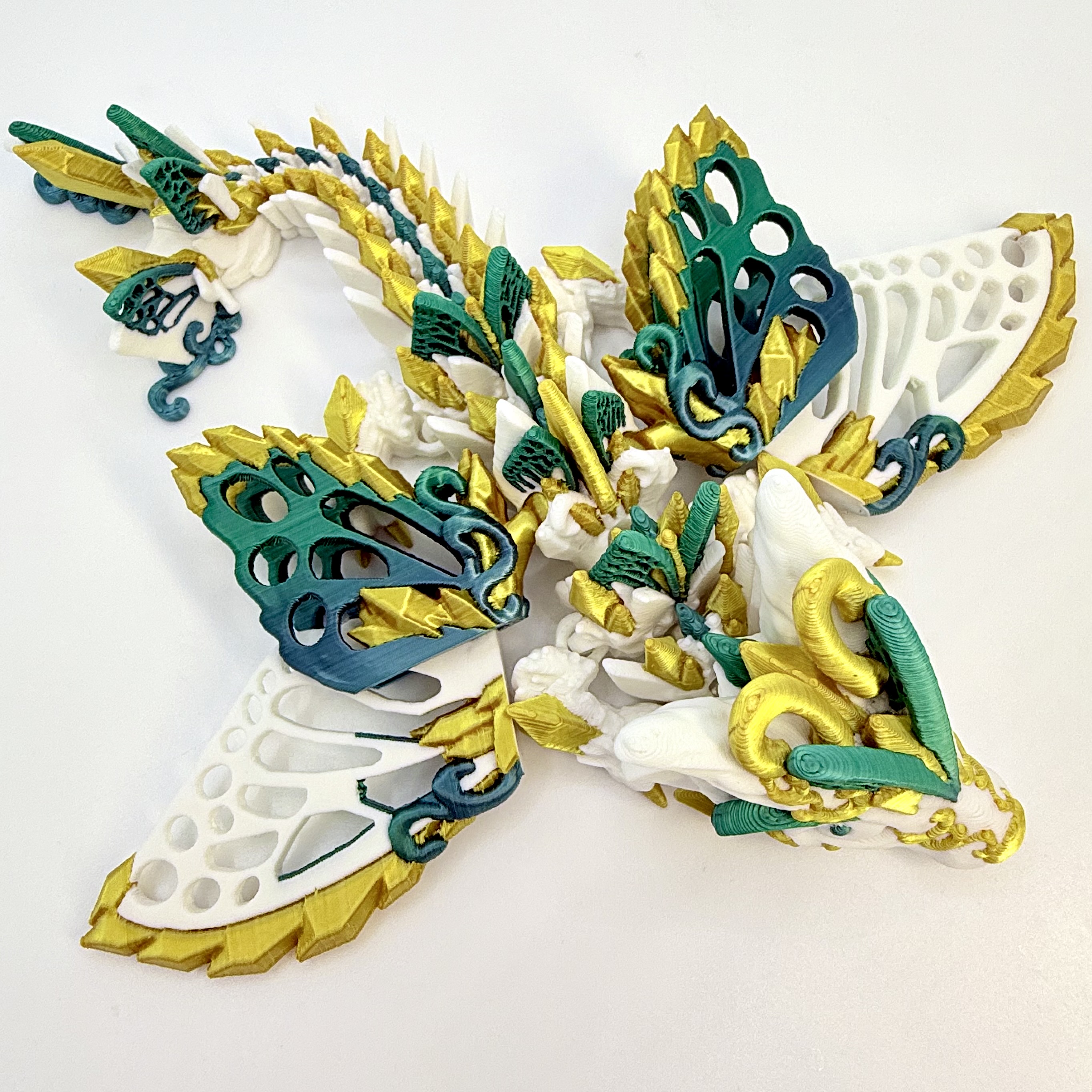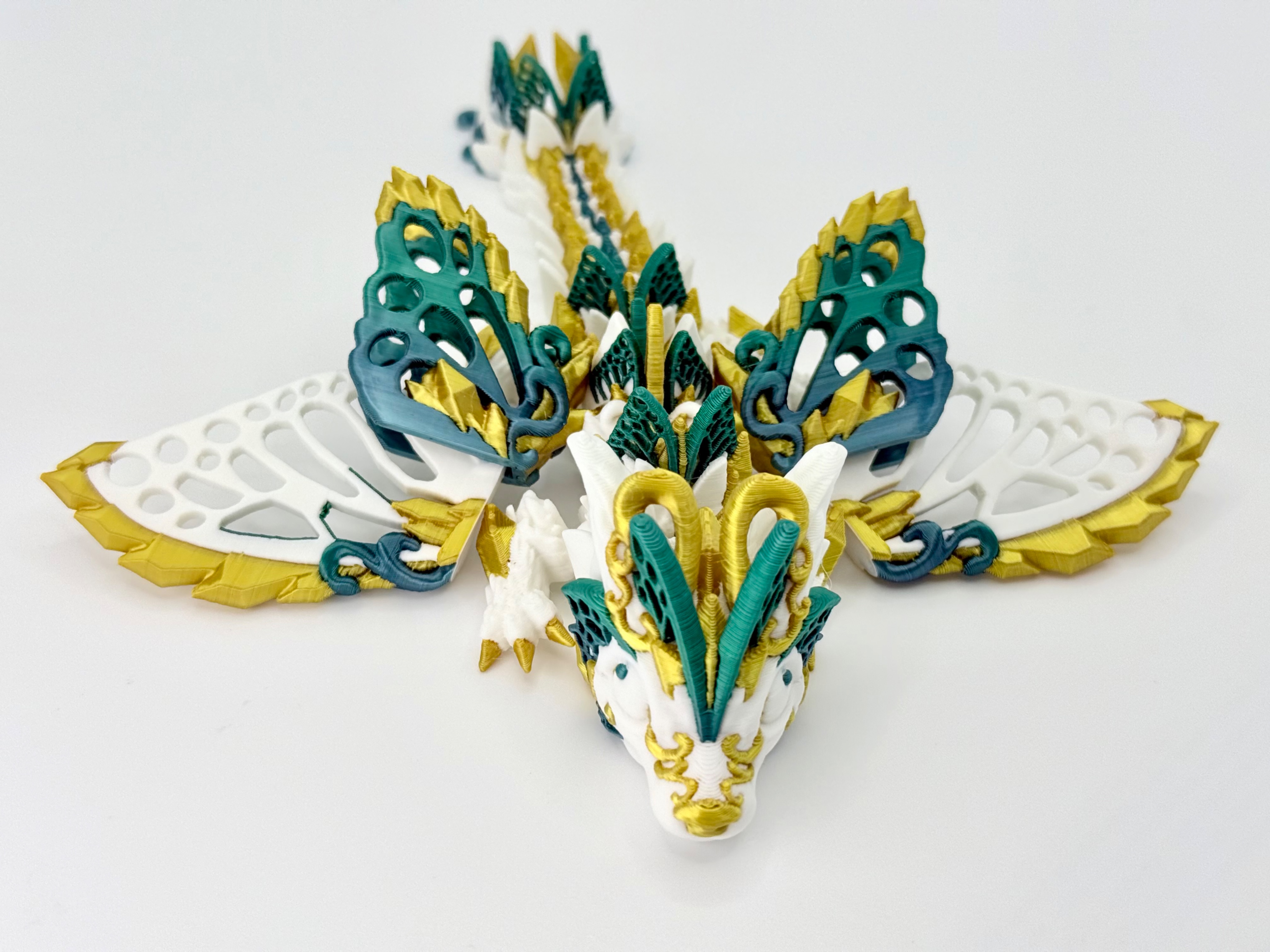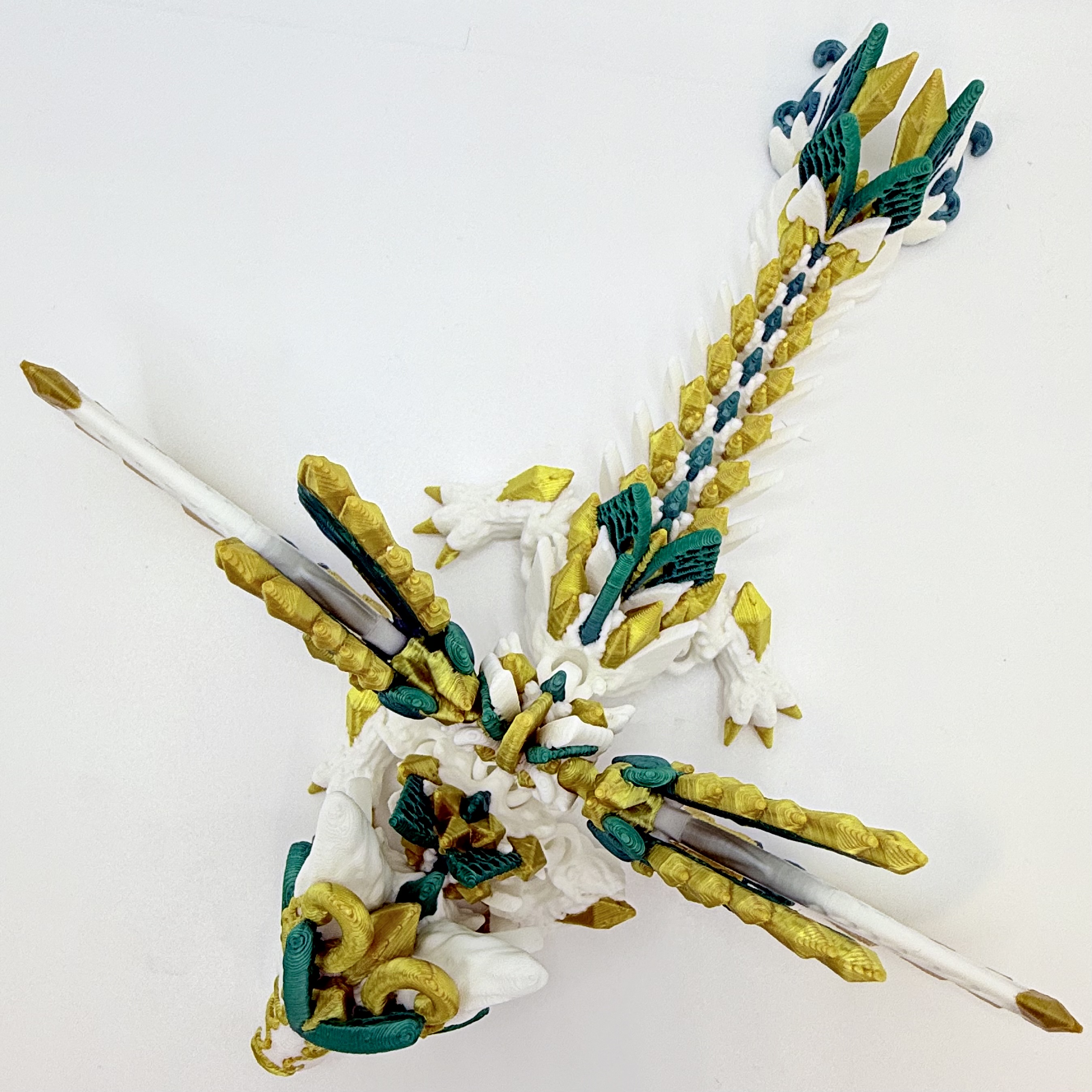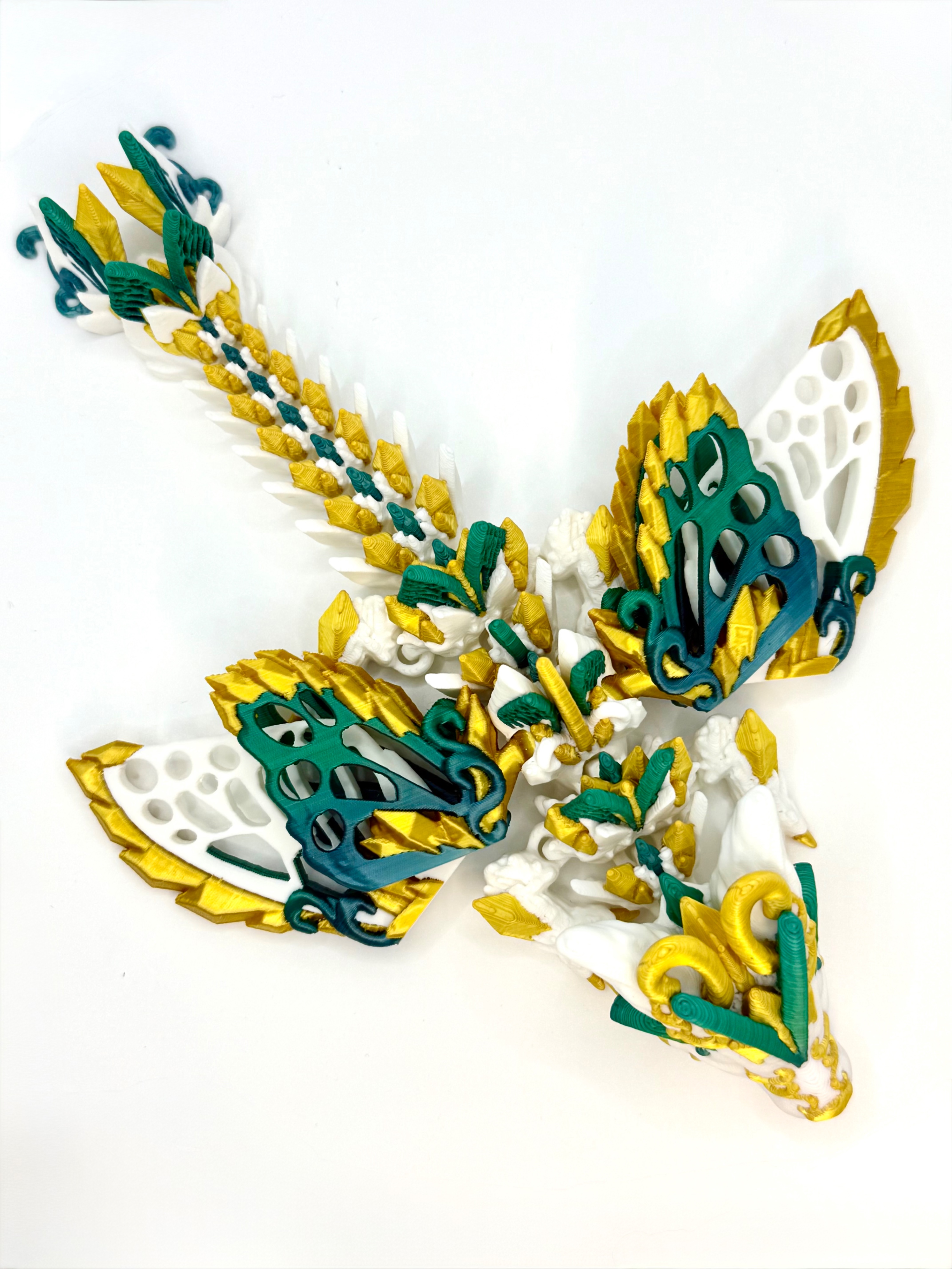 Jego śnieżnobiałe ciałko ozdobione jest eleganckimi złotymi akcentami, a skrzydła mienią się gradientem od koloru morskiej fali aż po głęboki szmaragd. Dzięki ruchomym skrzydłom możesz ustawiać go w różnych pozach – gotowego do lotu, odpoczynku albo straży nad Twoją kolekcją.