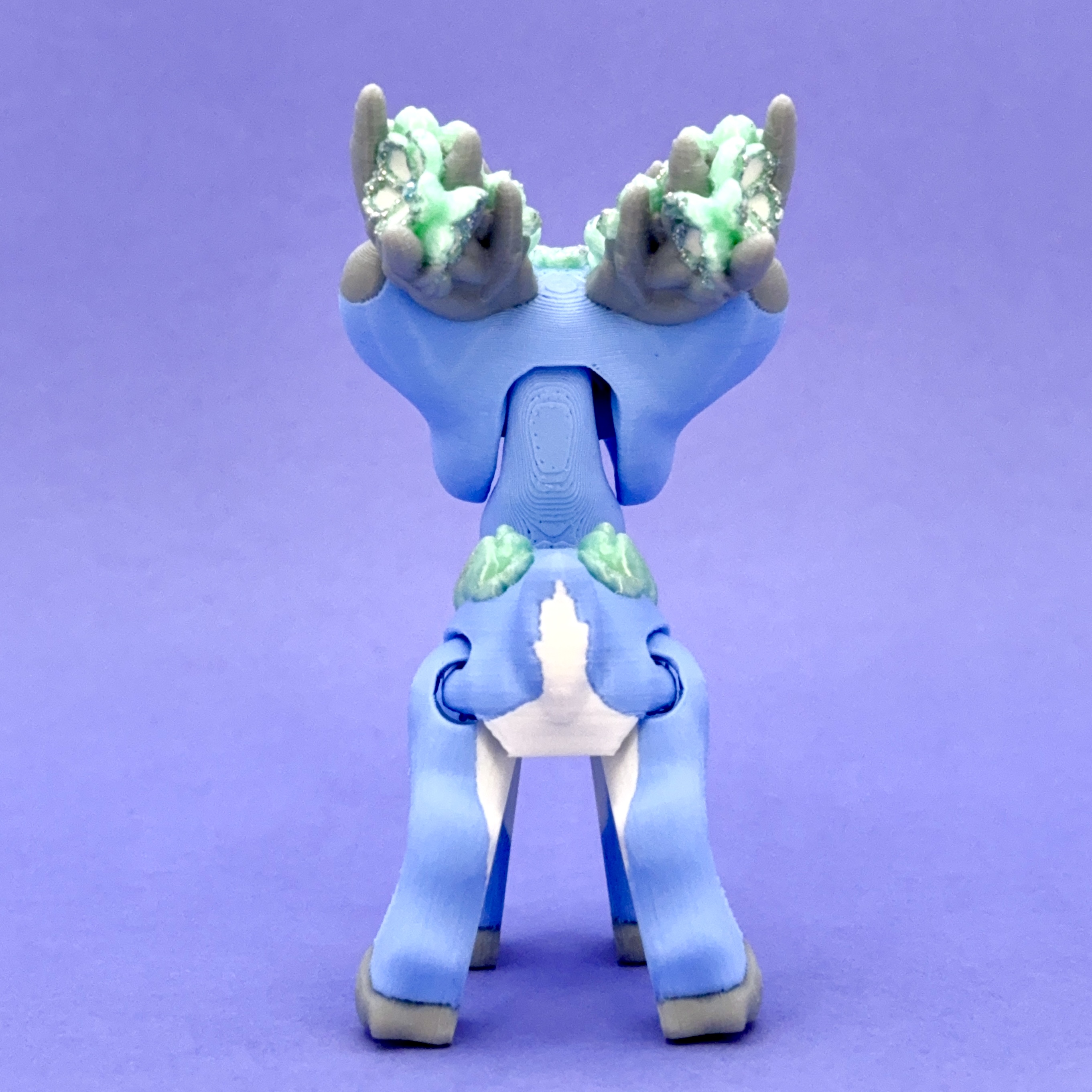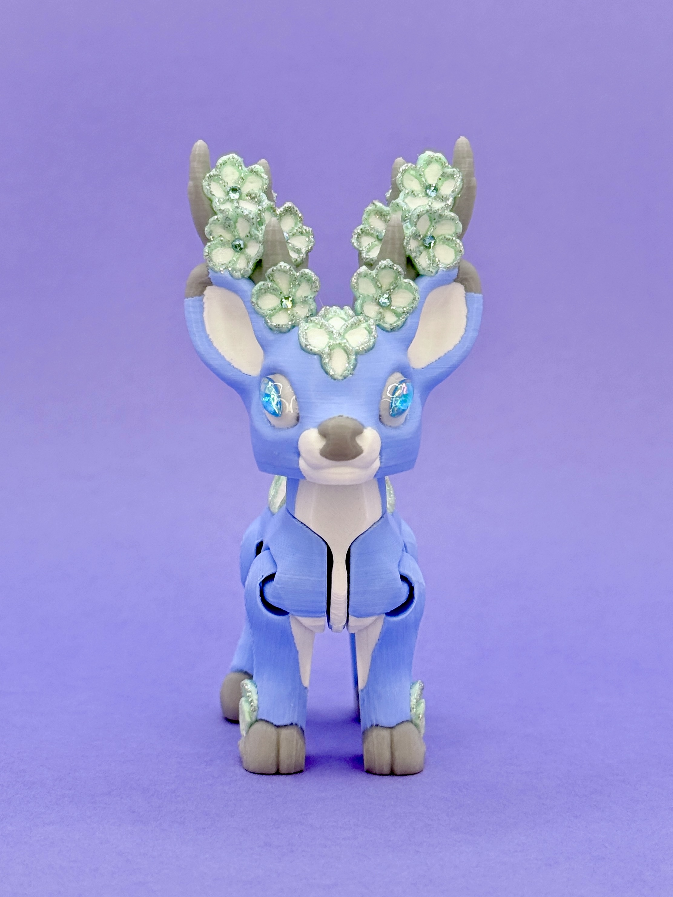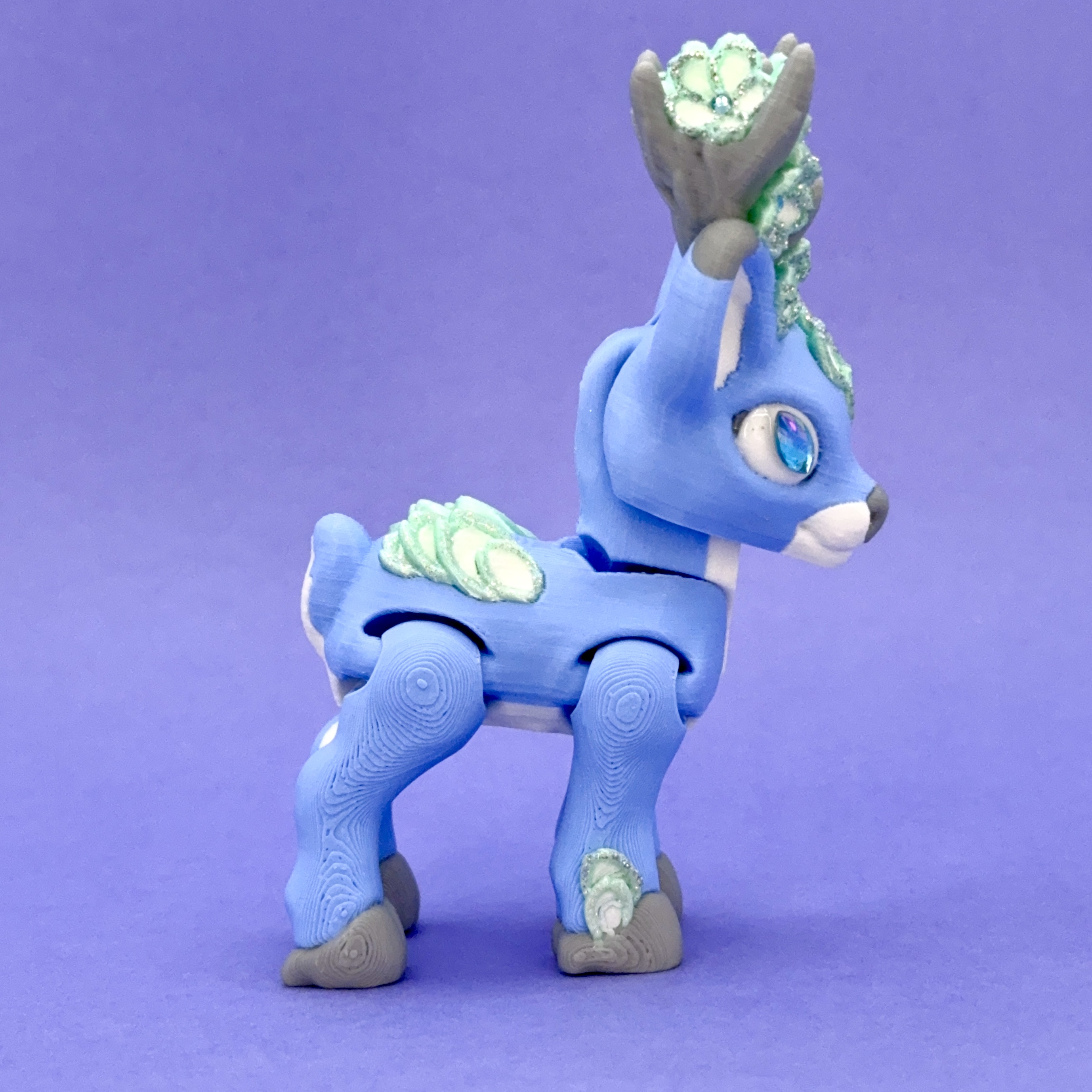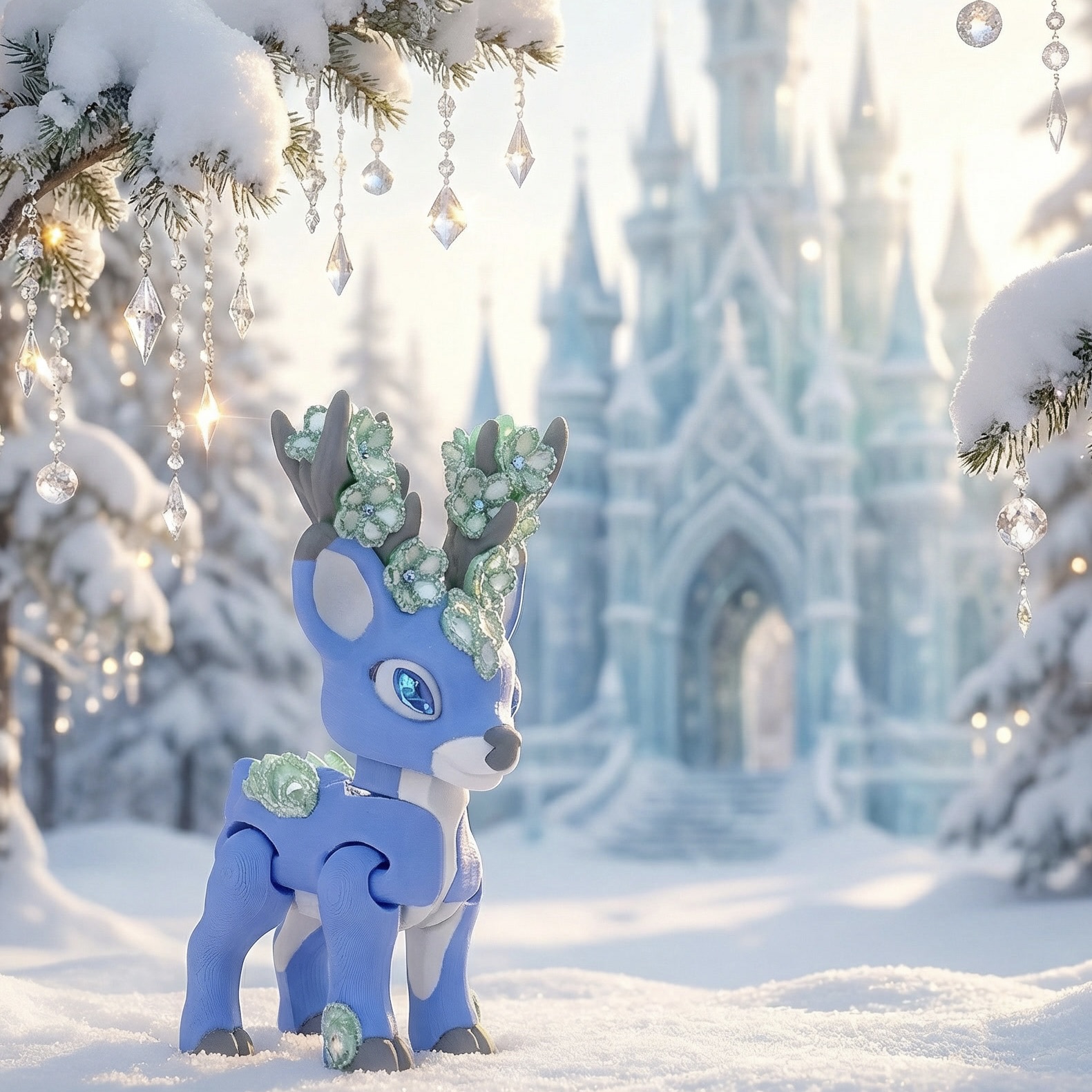 Na porożu i grzbiecie wyrastają misterne „kwiaty” w odcieniach bieli, mięty i srebrzystego blasku — wyglądają jak płatki pokryte kryształowym mrozem. Oczy zdobią iskrzące się kryształki, nadające figurce głębi i baśniowego charakteru.