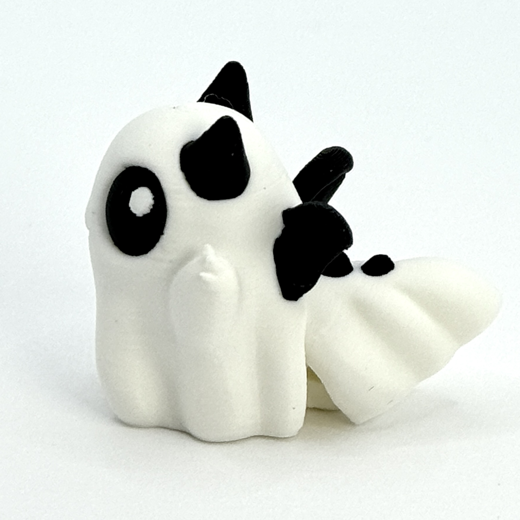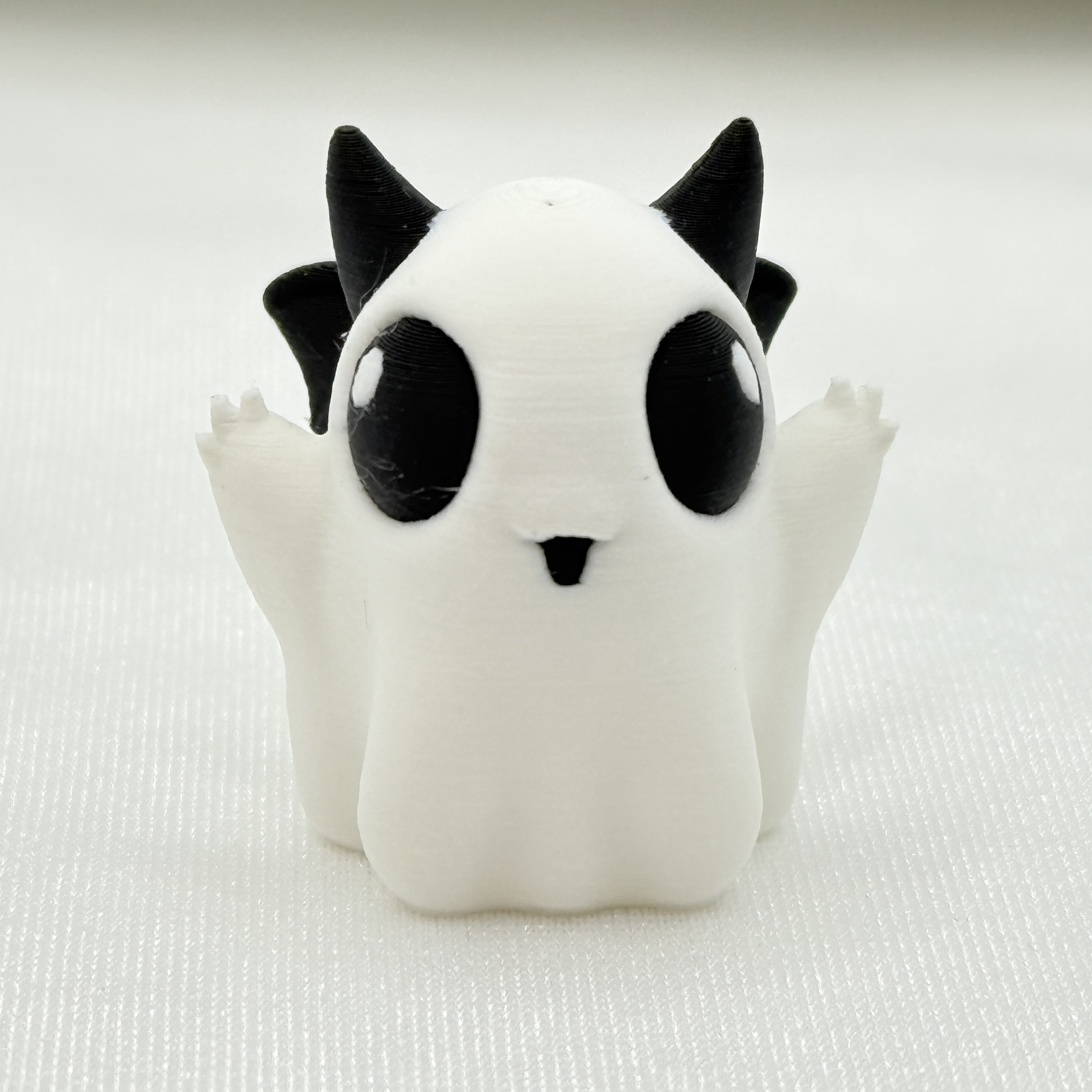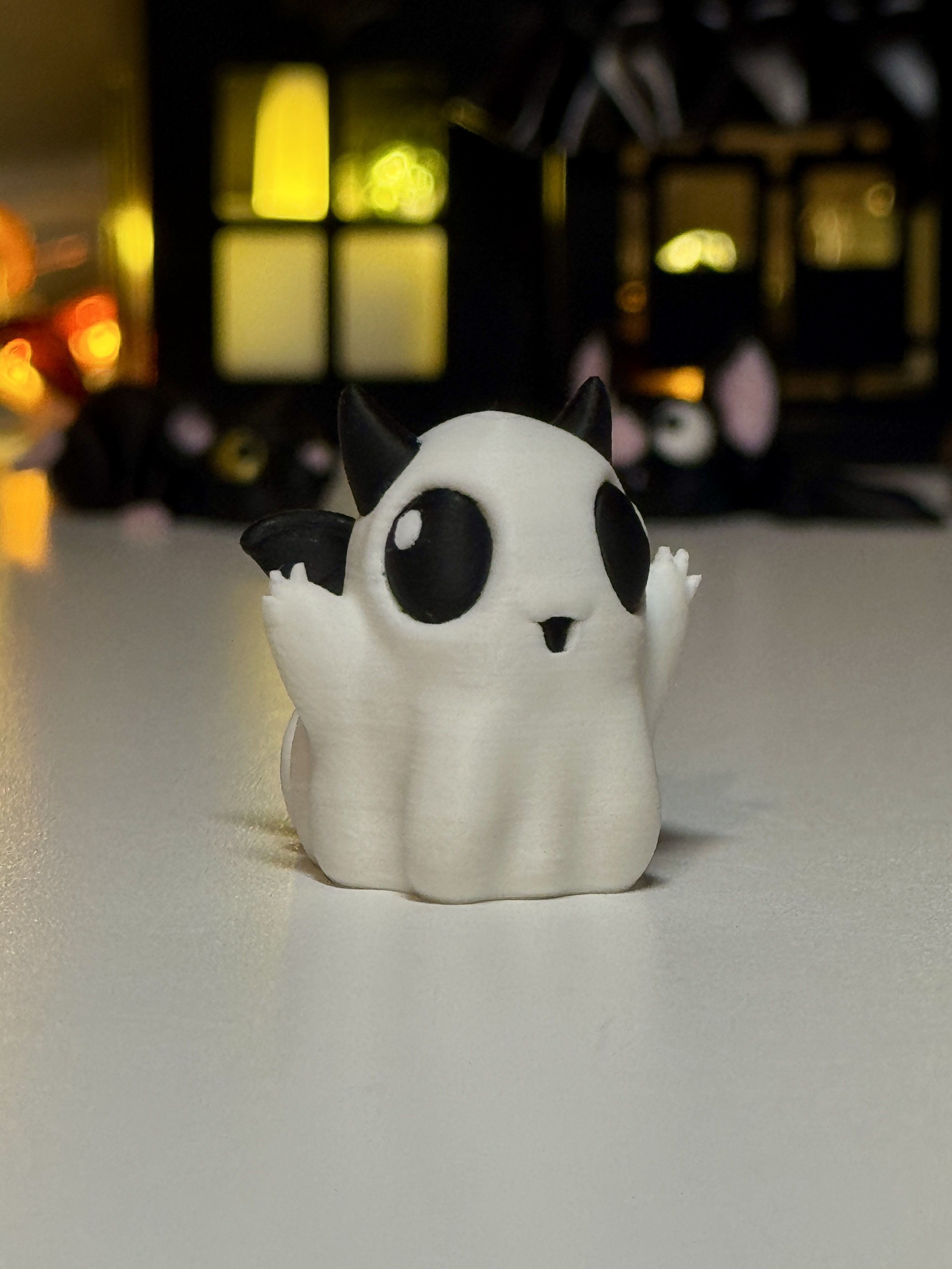 Duszek został wydrukowany z wysokiej jakości filamentu w odcieniach czerni i bieli, co nadaje mu wyjątkowy kontrast i charakter. Jego małe skrzydełka i rogi wystają spod „duchowej pelerynki”, tworząc efekt uroczego halloweenowego przebrania.