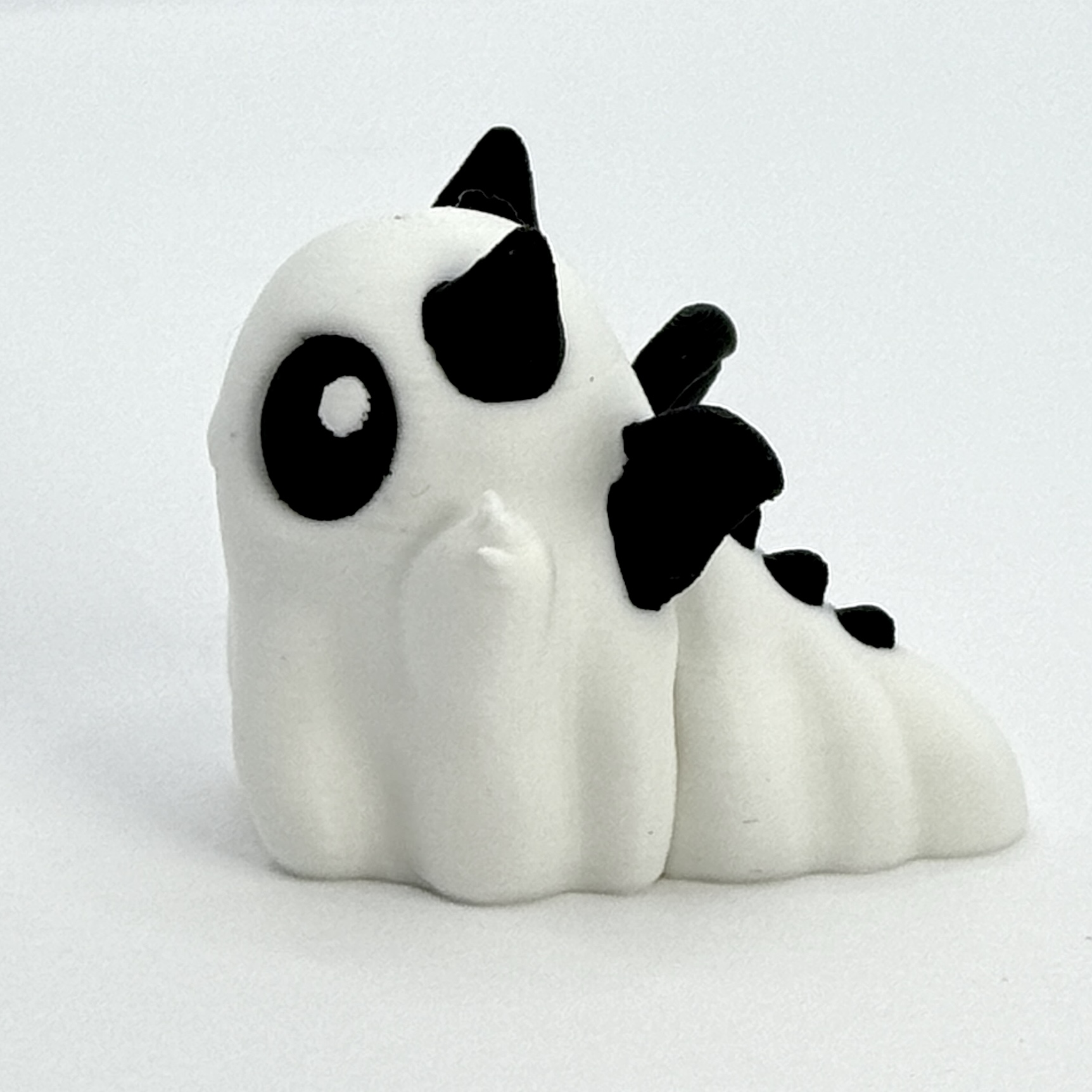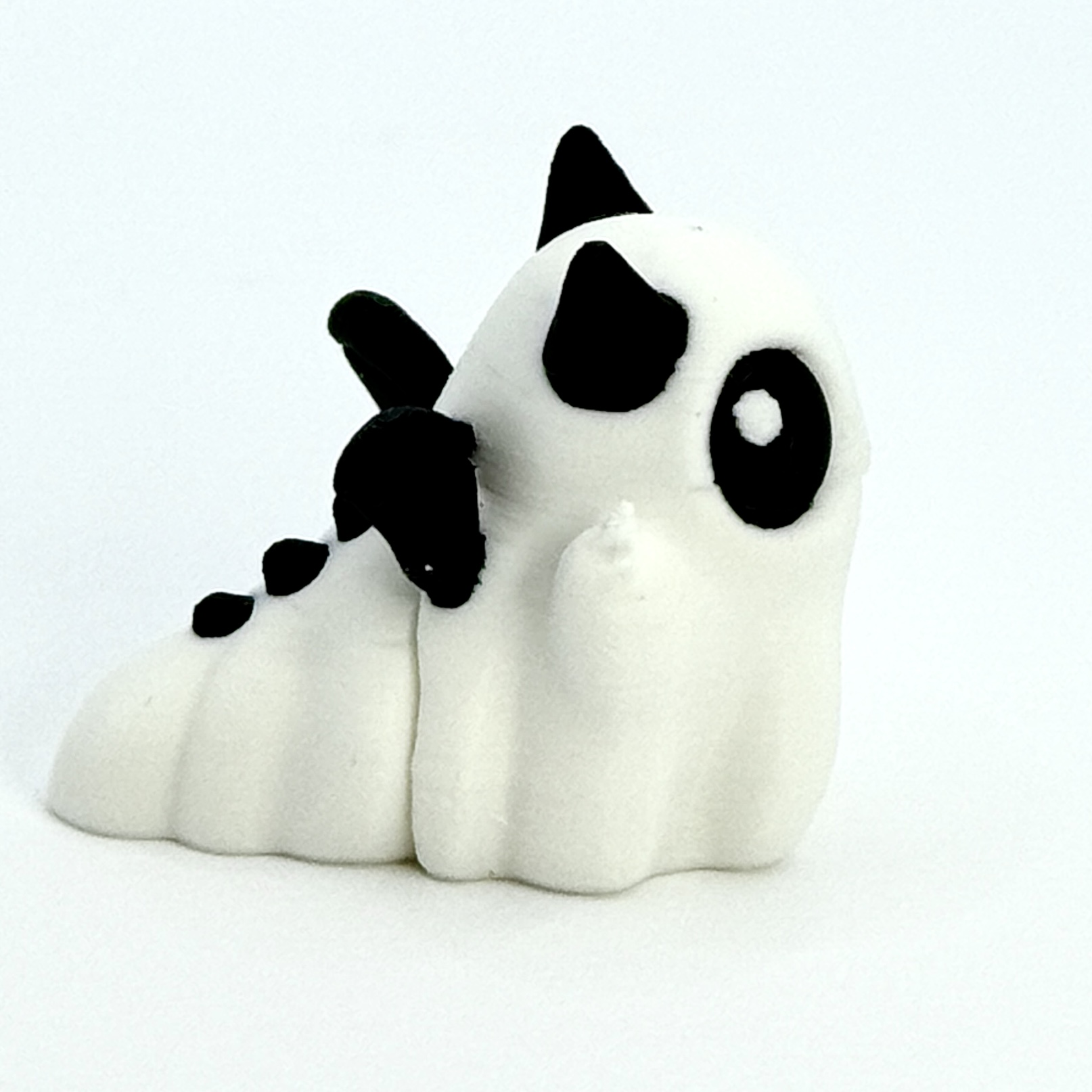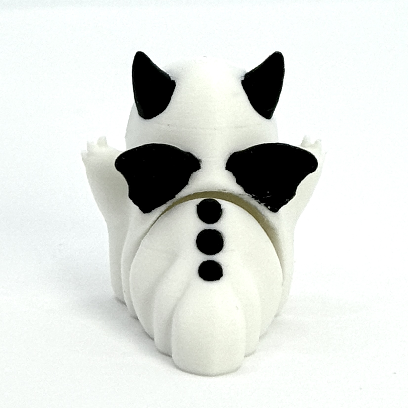 Duszek został wydrukowany z wysokiej jakości filamentu w odcieniach czerni i bieli, co nadaje mu wyjątkowy kontrast i charakter. Jego małe skrzydełka i rogi wystają spod „duchowej pelerynki”, tworząc efekt uroczego halloweenowego przebrania.